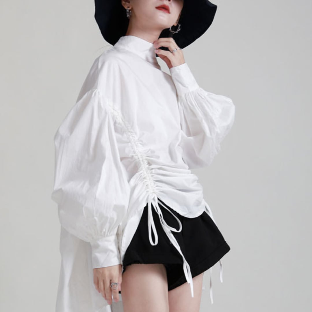 Lantern sleeve fluffy drawstring shirt(ME066)