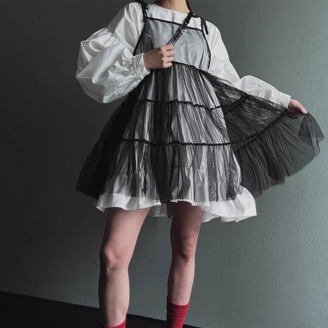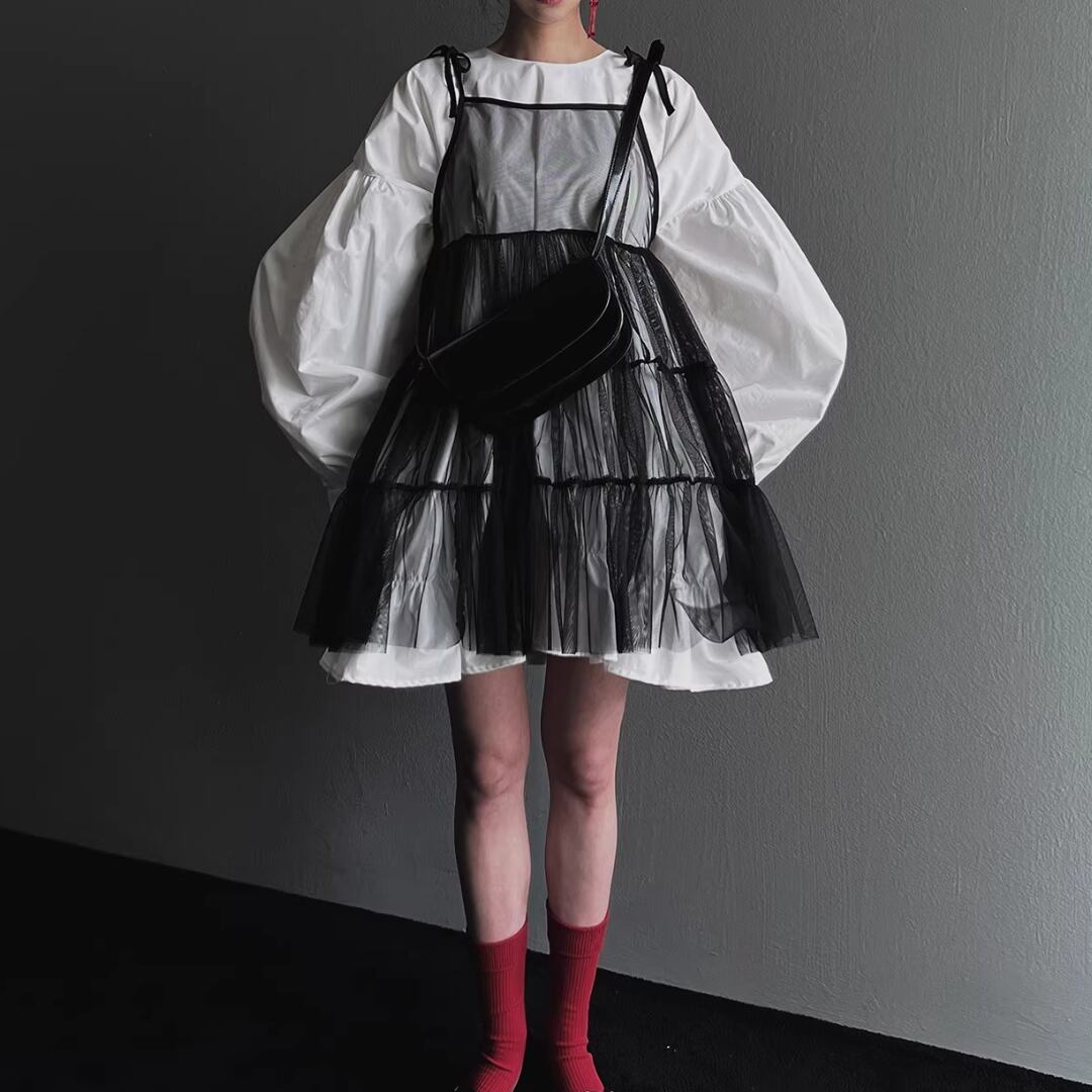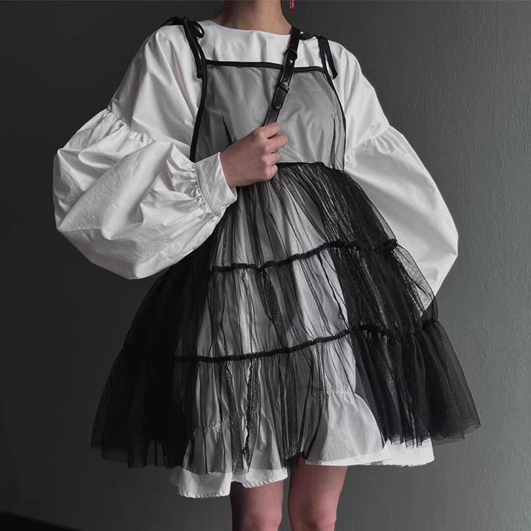 Elegant Lantern Sleeve Shirt Dress Set with Sheer Mesh Slip (ME212)