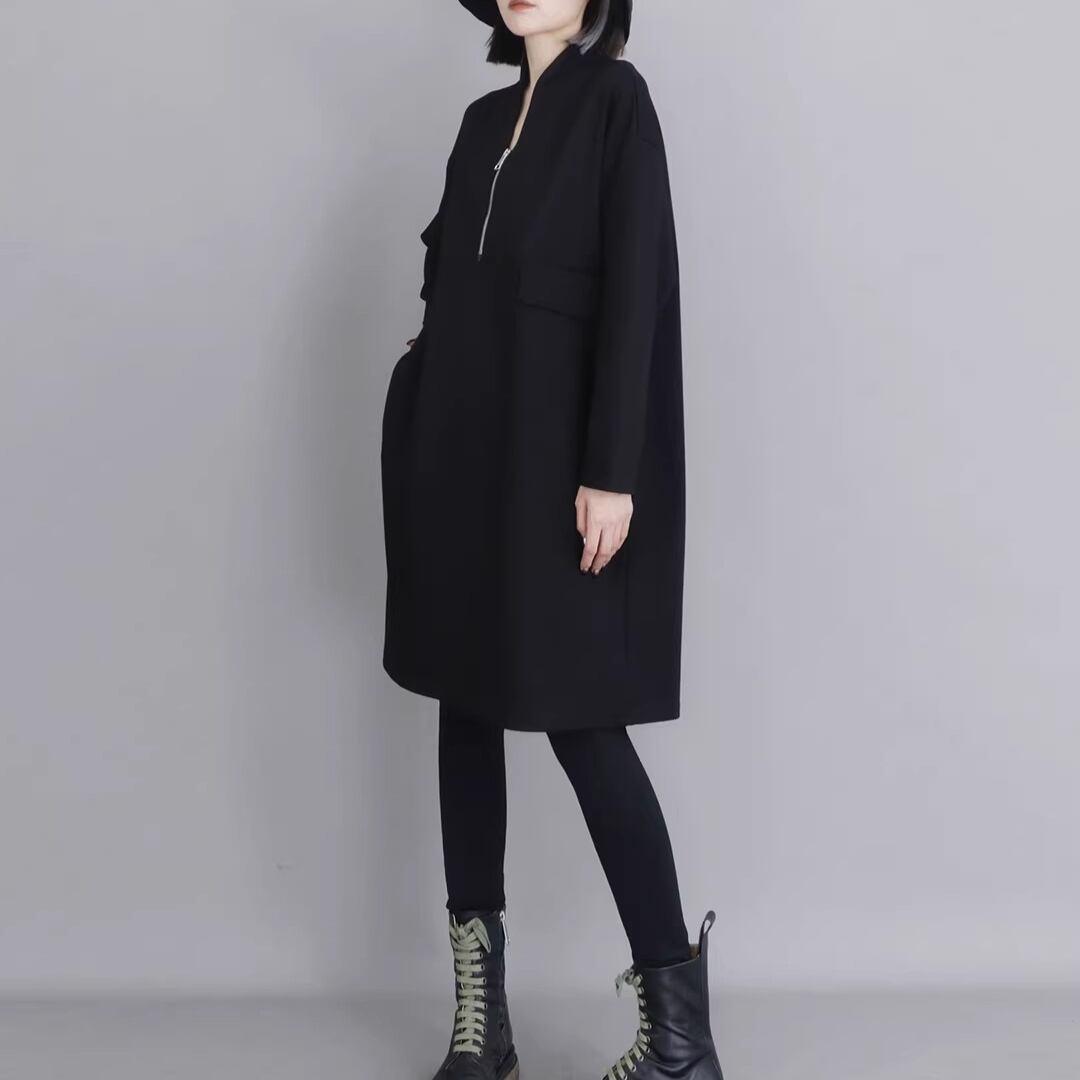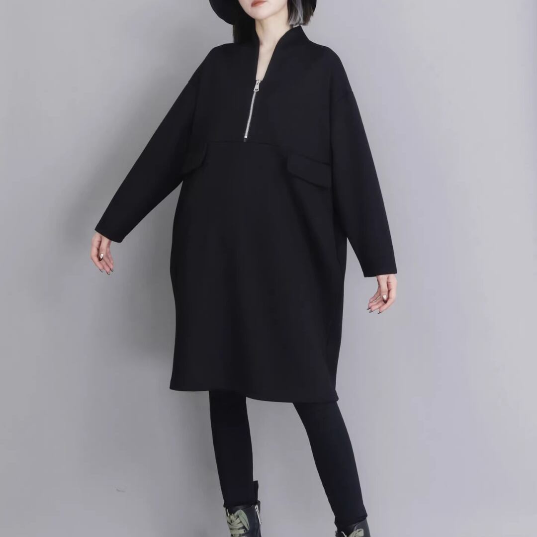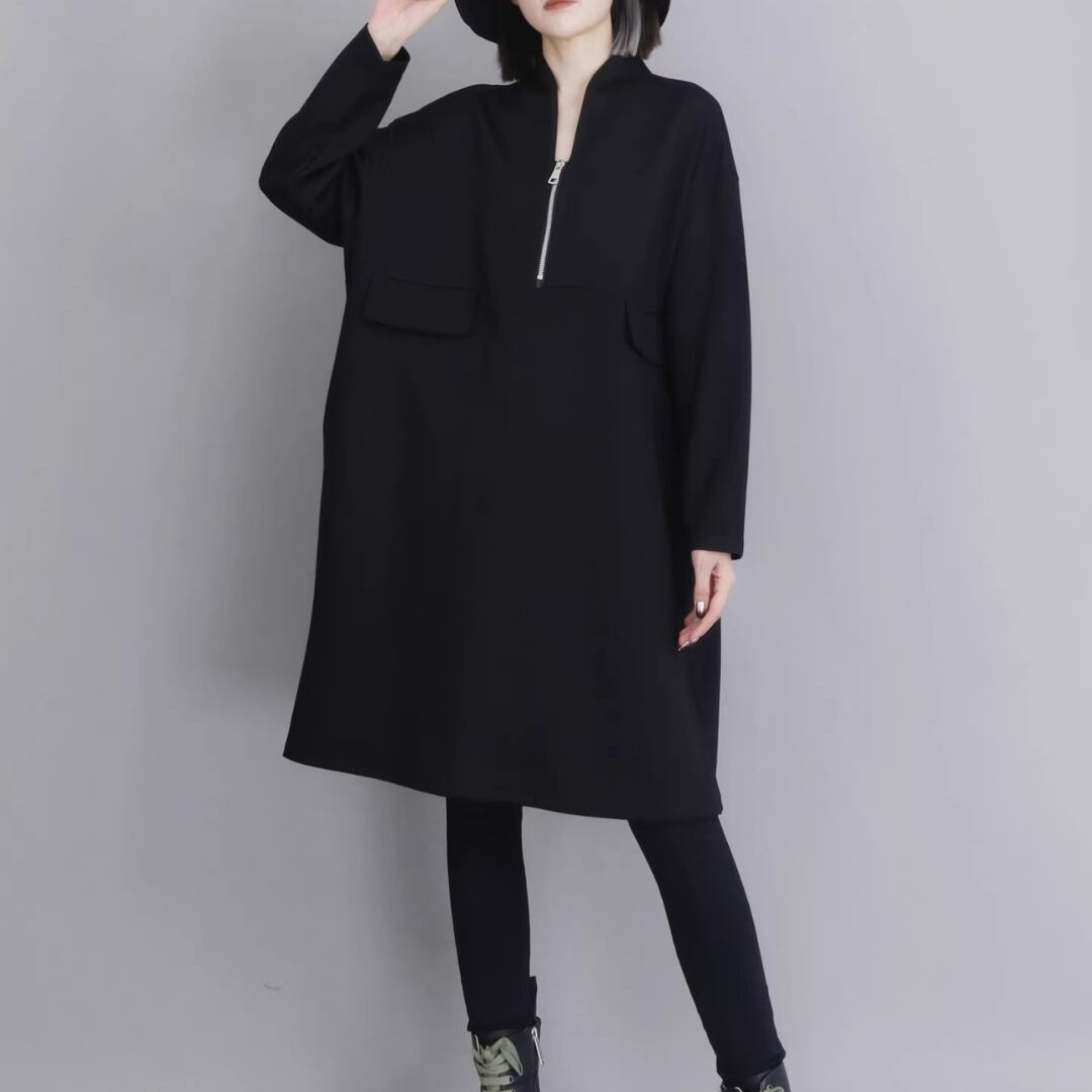 Black Minimal Style Midi Dress, Loose Fit Zip-Up Casual Dress (ME278)