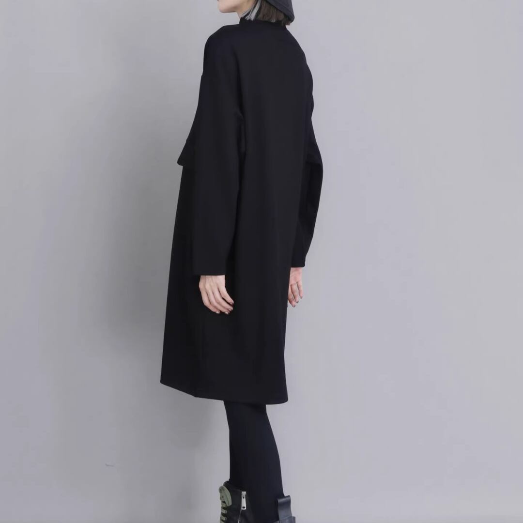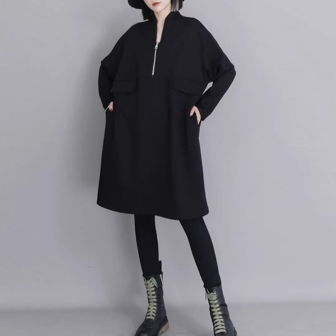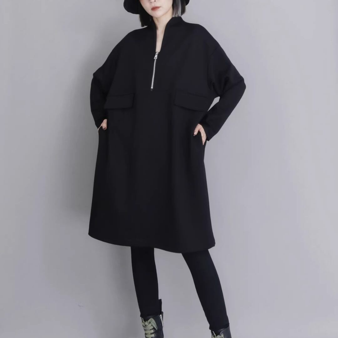 Black Minimal Style Midi Dress, Loose Fit Zip-Up Casual Dress (ME278)