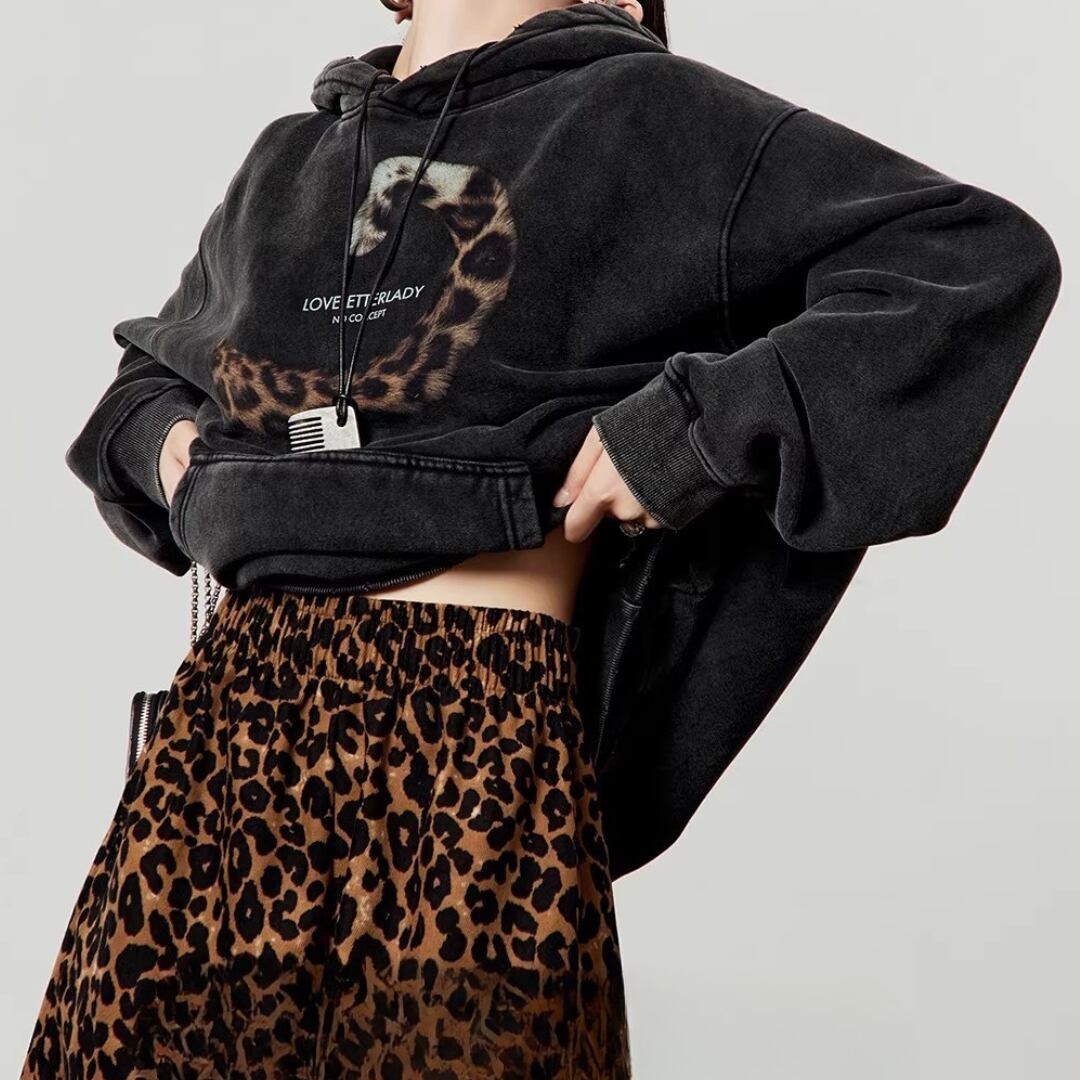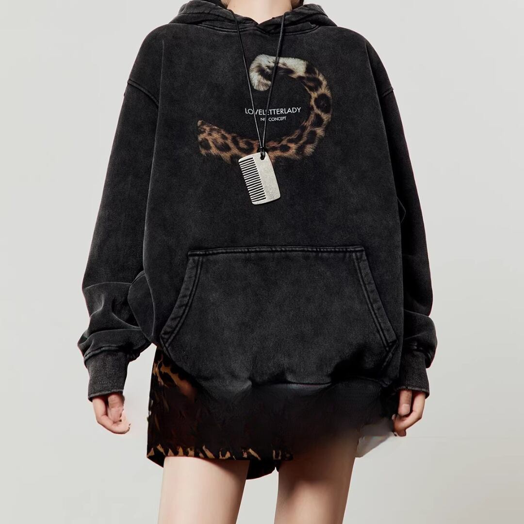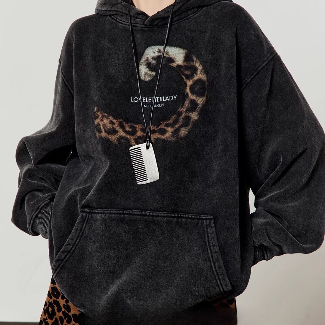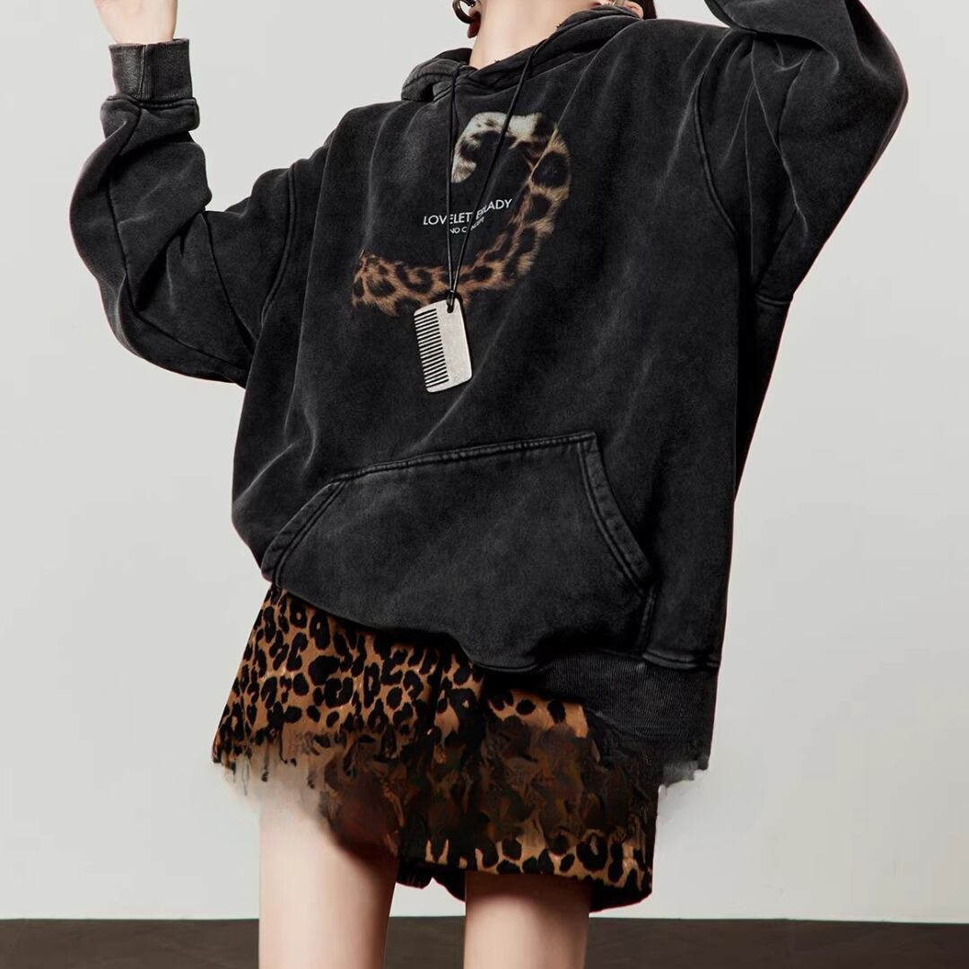 Black Sweatshirt, Retro Leopard Tail Graphic Commuter Top (ME276)