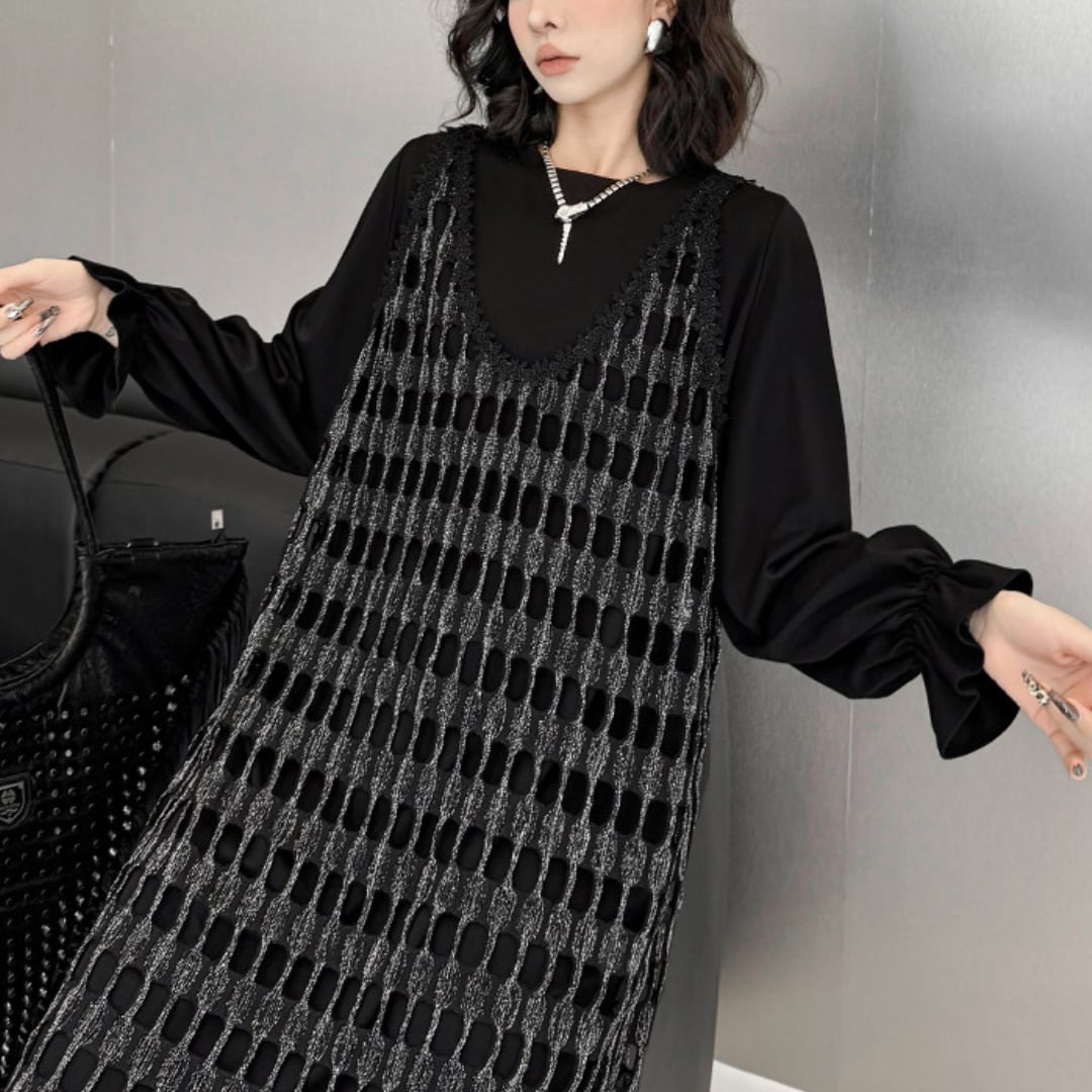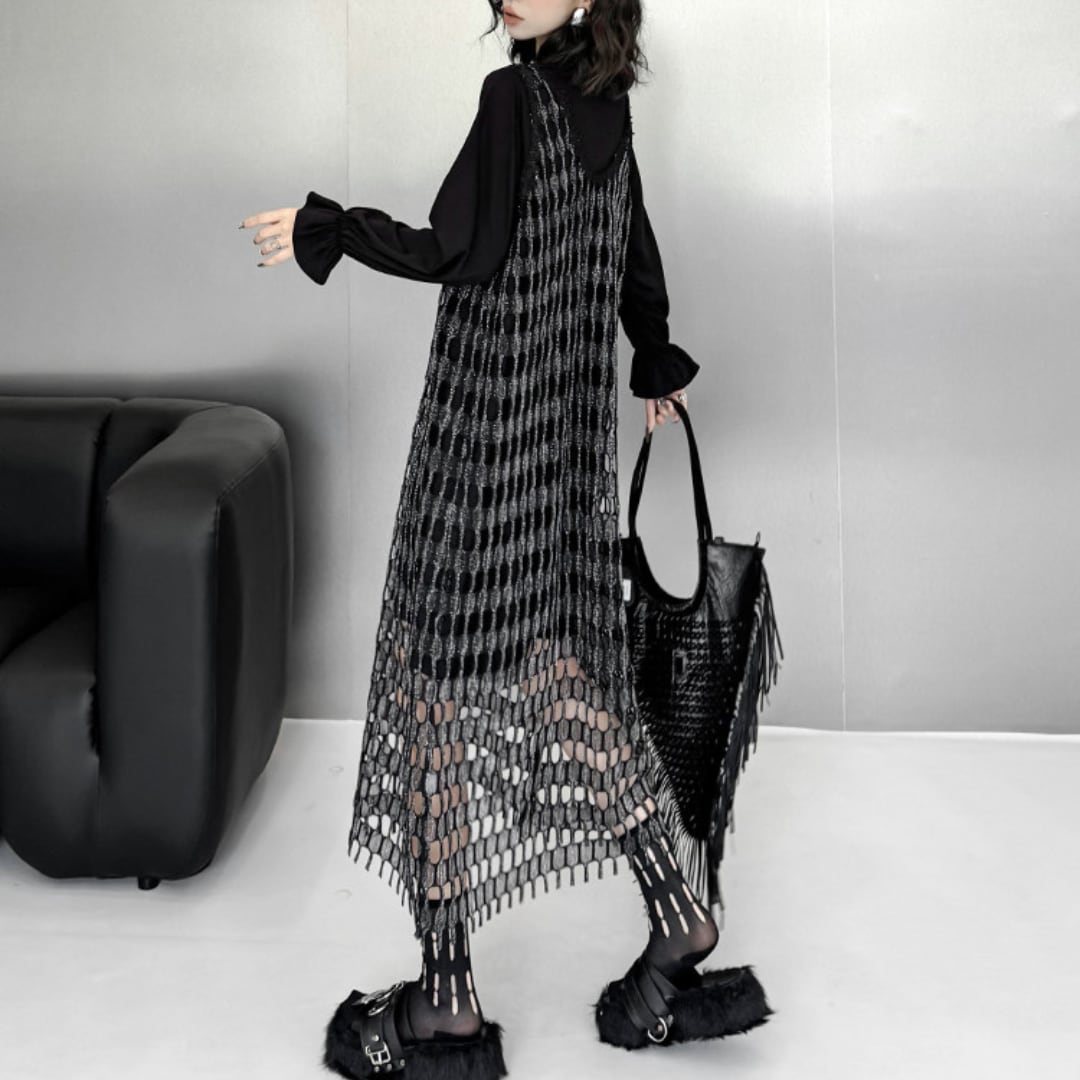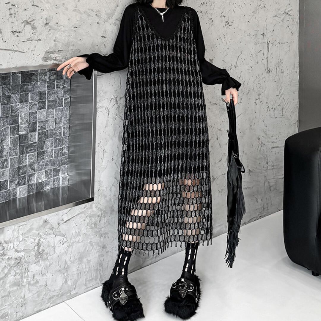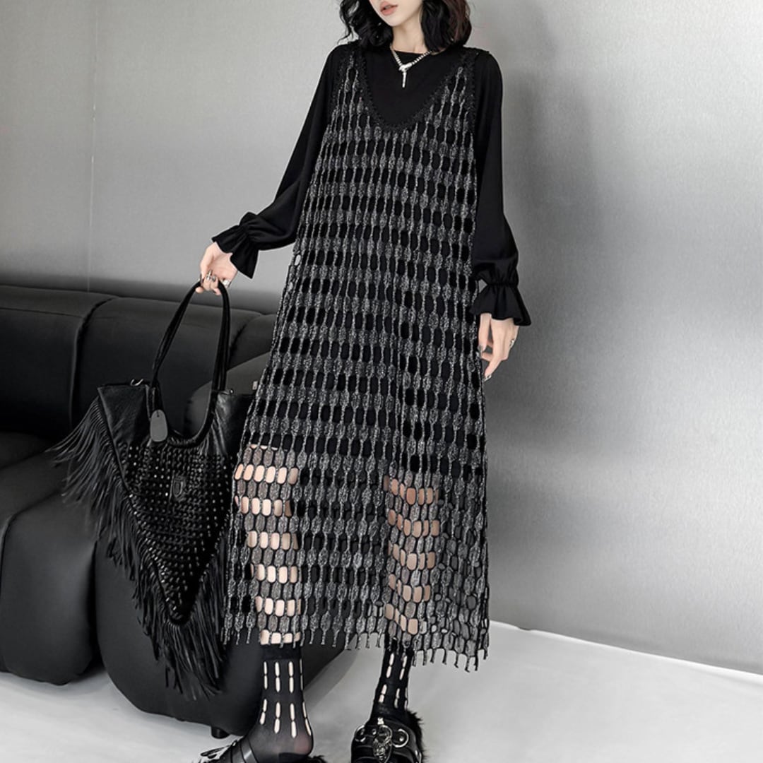 Silver mesh vest and long-sleeved T-shirt two-piece set (ME384)