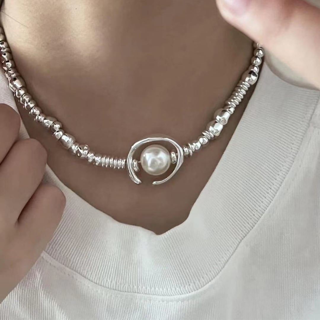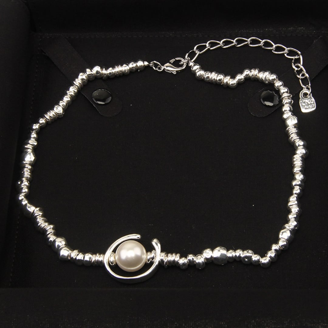 Silver half-moon shaped pearl patchwork necklace (ME387)